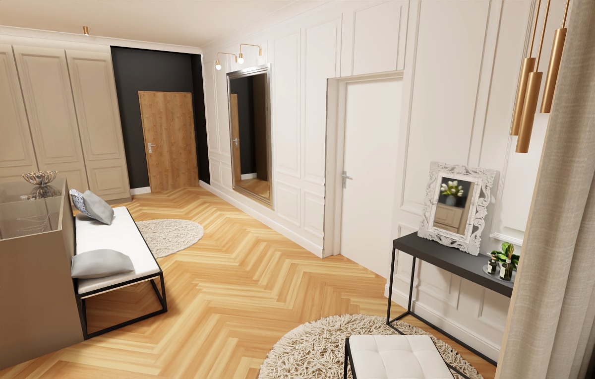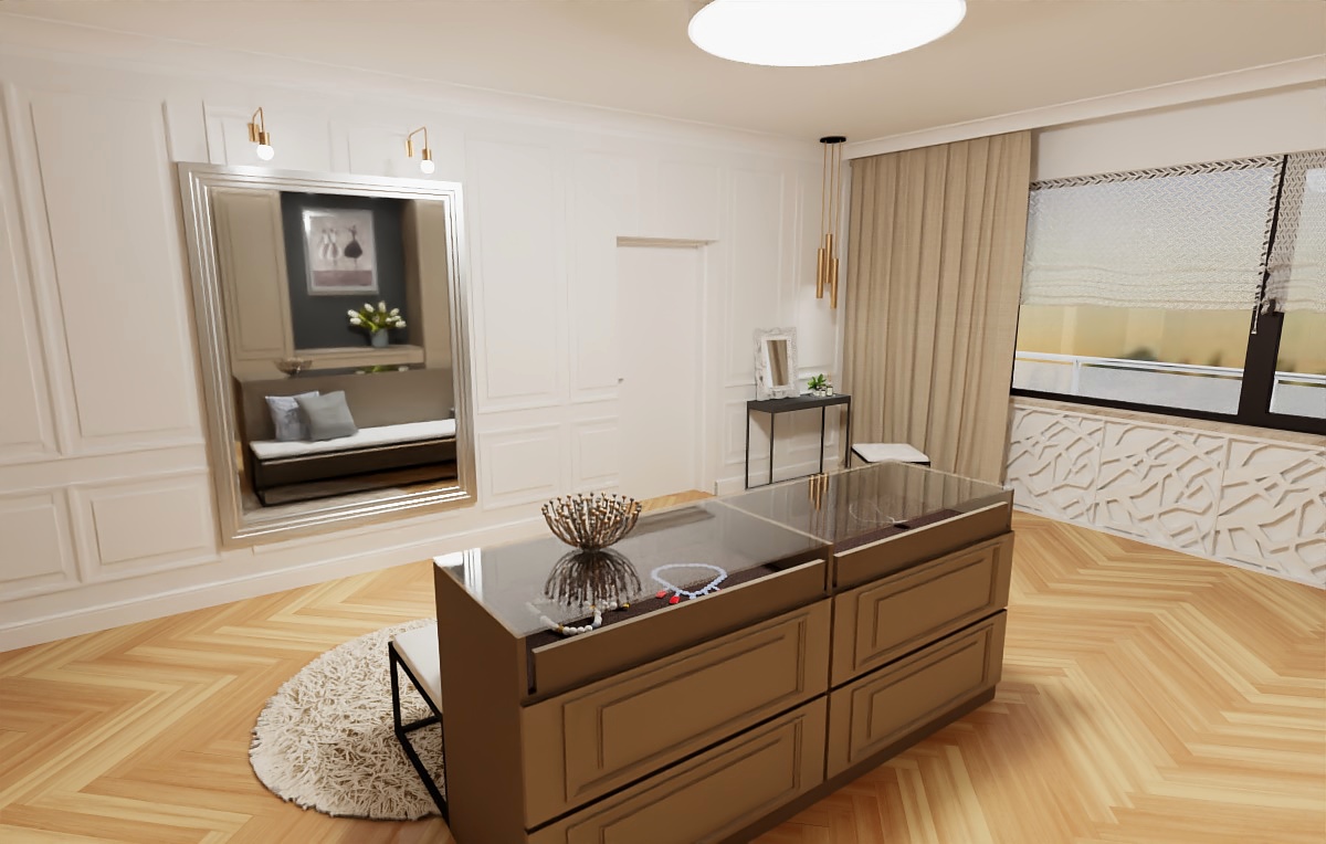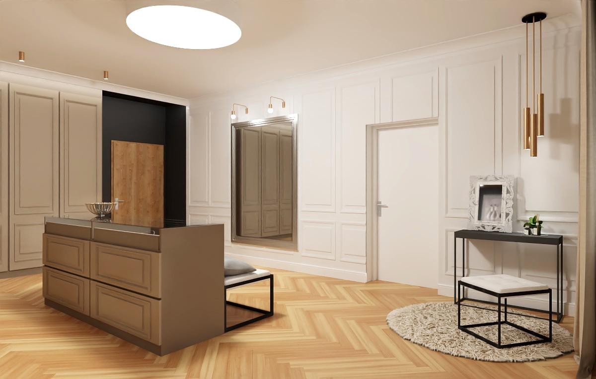 ...wypełniona przepychem, czyli kontynuacja projektu sypialni z nutką glamour. A oto co mieści się za ukrytymi pod efektowną tapetą drzwiami...